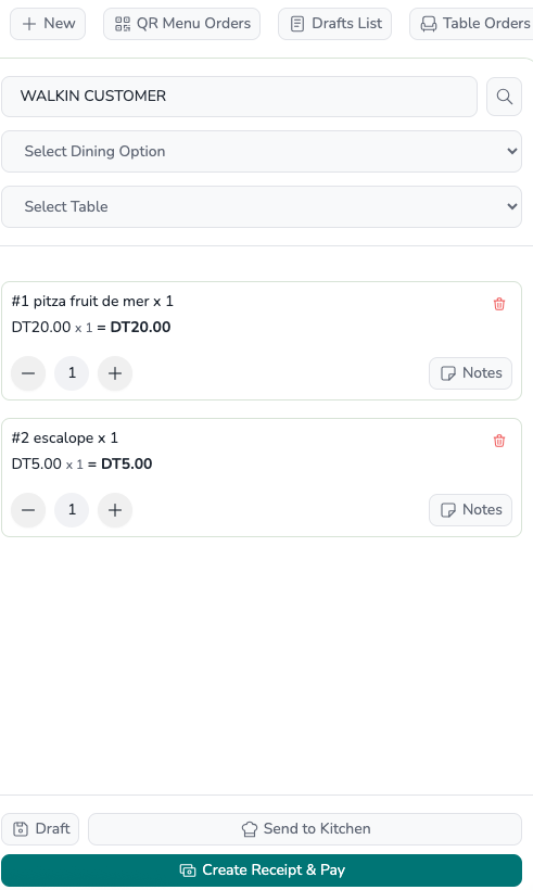 Order creation (Dine-in, Takeaway)