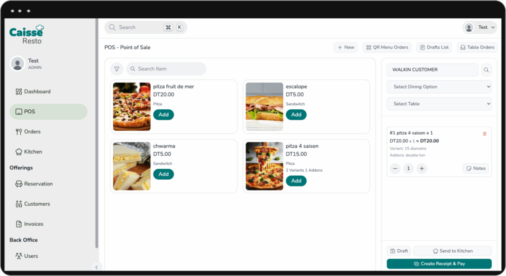 Streamline your operations with Resto Caisse’s smart POS. Easily manage orders, product categories, and item variants. Instantly send tickets to the kitchen and accept secure payments — all from one seamless platform.